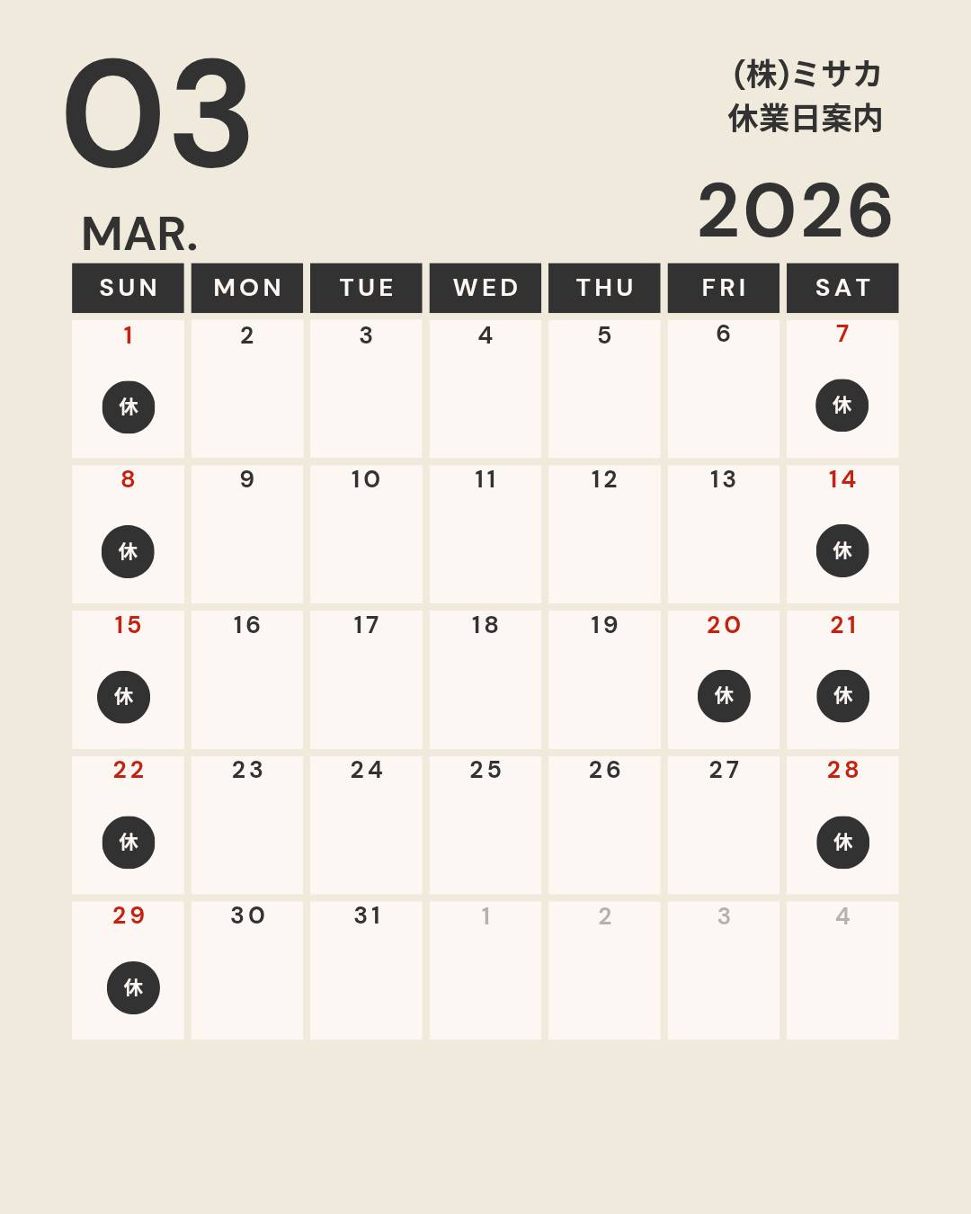 3月の休業日案内♪ 2026.02.13 休日案内 本社スタッフBlog 閲覧数:486 3月の休業日のご案内です🙋🏻♀️✨ 上記をご確認の上、ご来店、ご連絡をお願い致します🙇 Post Share Hatena RSS